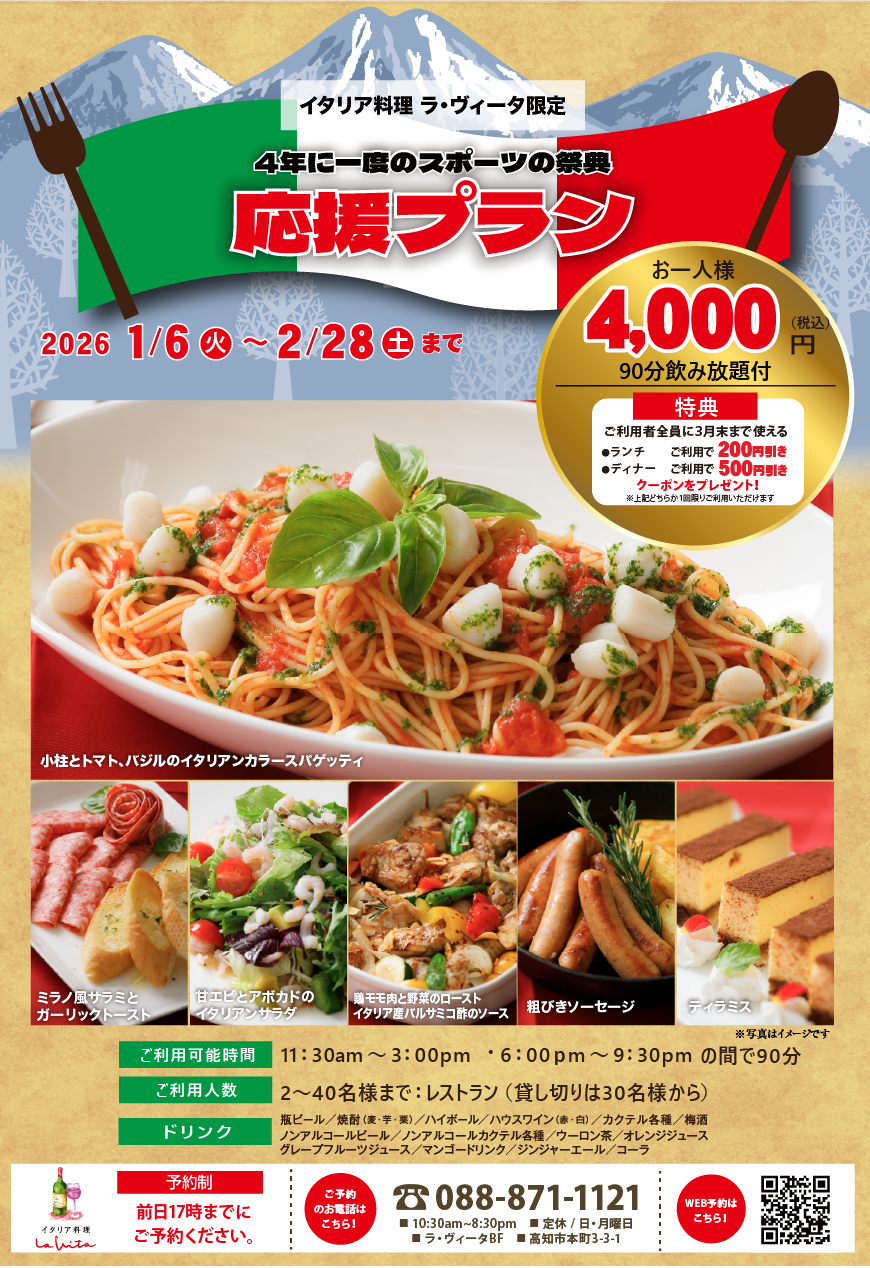 | 特典 | ご利用者全員に3月末まで使えるクーポンプレゼント! ・ランチご利用で200円引き ・ディナーご利用で500円引き ※上記どちらか1回限りご利用いただけます |